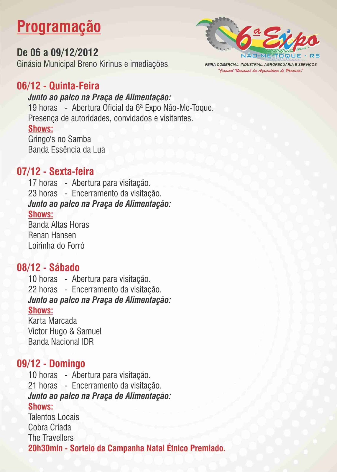 PARA OS DIAS 06 A 09 DE DEZEMBRO/12, NA 6ª EXPO NÃO-ME-TOQUE, MAIS PRECISAMENTE A PRESENÇA SE FAZ